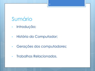 O documento descreve a história do computador desde as primeiras ferramentas de cálculo como o ábaco até as gerações modernas de computadores. Ele discute inventores pioneiros como Charles Babbage e Alan Turing e como as invenções dos transistores e circuitos integrados levaram à miniaturização dos computadores ao longo do tempo.