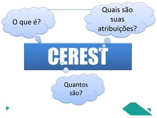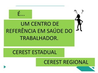 O documento descreve o Centro de Referência em Saúde do Trabalhador (CEREST), incluindo suas atribuições de fornecer suporte técnico e coordenação de projetos de saúde para trabalhadores, apoiar ações de saúde na atenção primária e serviços especializados, e atuar como articulador de ações intersetoriais de saúde do trabalhador. O CEREST deve ser constituído por equipes multiprofissionais para fornecer matriciamento na rede pública de saúde.