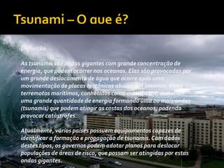 Um tsunami é uma série de ondas de água causada por um grande deslocamento de volume de água, geralmente provocado por terremotos ou erupções vulcânicas. Tsunamis podem causar grandes catástrofes em regiões costeiras devido ao seu enorme volume de água e energia. Países desenvolvidos possuem equipamentos para detectar a formação e propagação de tsunamis e alertar a população para que possa se deslocar de áreas de risco.