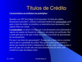 O documento discute os principais aspectos dos títulos de crédito, incluindo: