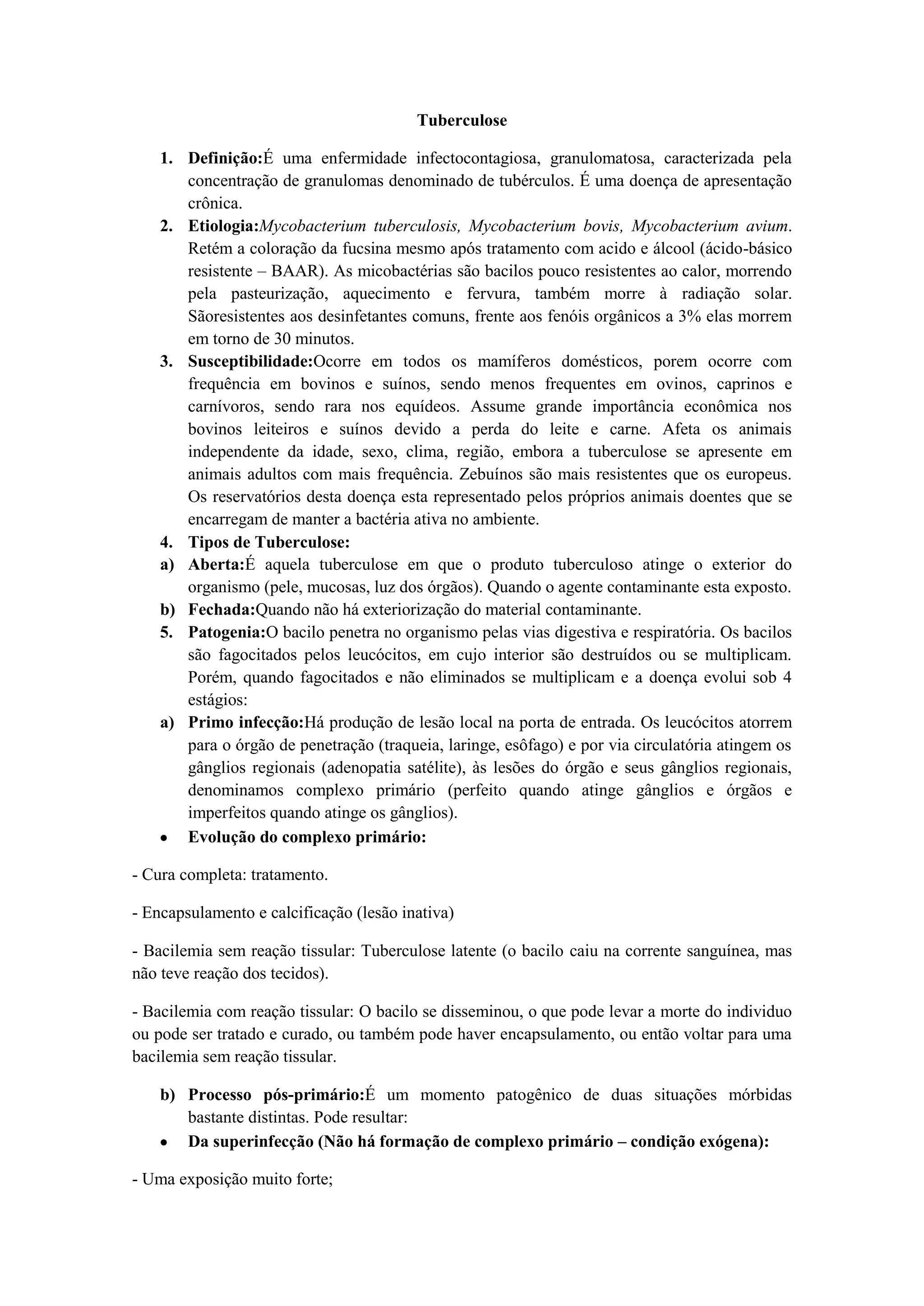 1. A tuberculose é uma doença infectocontagiosa causada pela bactéria Mycobacterium tuberculosis que forma lesões granulomatosas chamadas tubérculos.