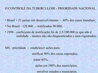 O documento discute a tuberculose como um grave problema de saúde pública no Brasil e em países em desenvolvimento. A prioridade nacional é o controle da doença através da identificação de casos sintomáticos, diagnóstico e tratamento supervisionado. A transmissão ocorre principalmente por via aérea através da eliminação de bacilos pela tosse e espirro de pessoas infectadas.