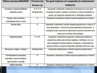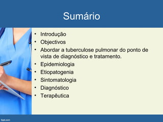 - O documento discute a tuberculose, incluindo sua epidemiologia, etiologia, sintomas, diagnóstico e tratamento. Aborda os métodos de diagnóstico como radiografia de tórax e cultura, e discute esquemas terapêuticos para tuberculose sensível e resistente a medicamentos.