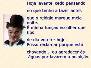 O documento discute como nossas atitudes diárias dependem de nós mesmos e como podemos escolher ser gratos ou reclamar das circunstâncias da vida. A frase final "Tudo depende só de mim" resume que somos responsáveis por dar forma ao nosso dia.