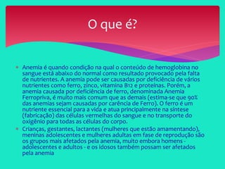 Anemia é uma condição em que o nível de hemoglobina no sangue está abaixo do normal, geralmente causada por deficiência de nutrientes como ferro, zinco ou vitamina B12. Crianças, gestantes e mulheres em idade reprodutiva são os grupos mais afetados, embora homens e idosos também possam ser afetados. O diagnóstico é feito por exames de sangue e o tratamento depende da causa subjacente, podendo envolver suplementação de nutrientes ou tratamento de doenças de base.