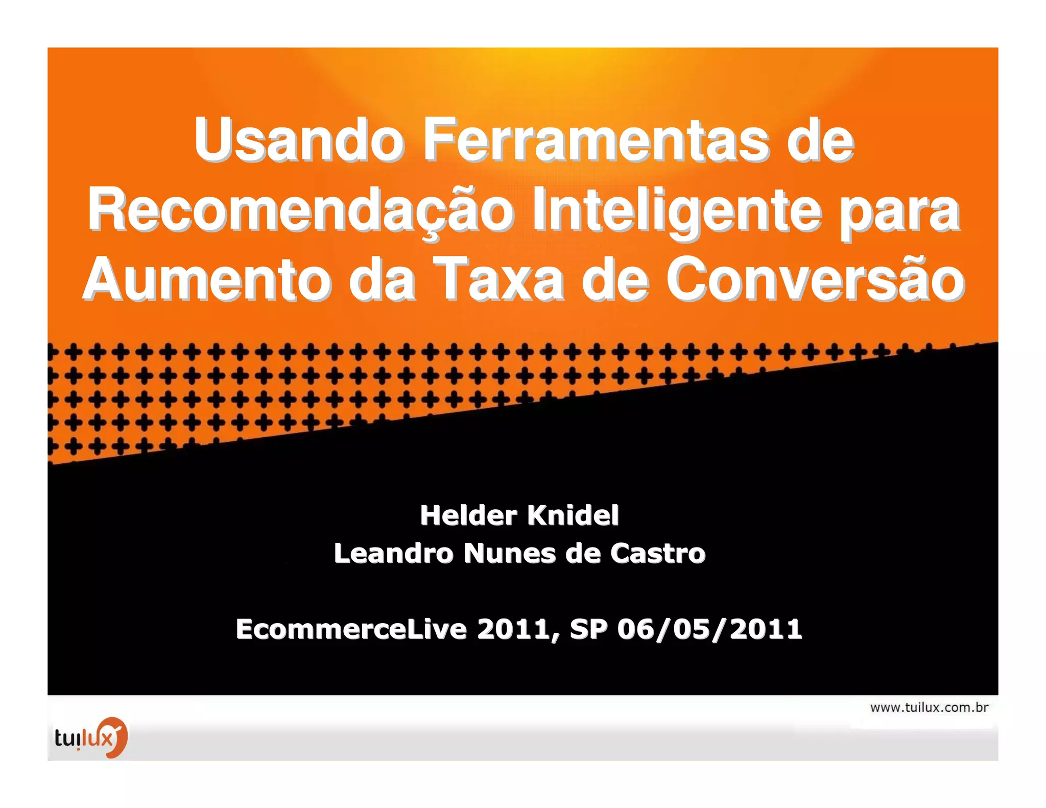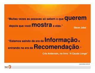 O documento discute o uso de ferramentas de recomendação inteligente para aumentar a taxa de conversão em e-commerce. Ele explica que monitorar comportamentos de clientes, entender preferências e fornecer o produto certo no momento certo podem melhorar vendas e fidelização. Também mostra como medir os resultados positivos dessa estratégia, como aumentos na receita, engajamento e tíquete médio.