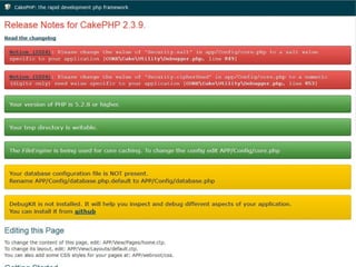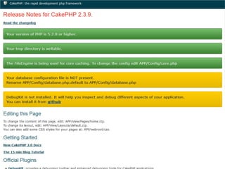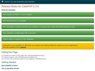 O documento apresenta o framework CakePHP, descrevendo suas principais características e vantagens, como padronização, velocidade, qualidade e manutenção facilitadas. Explica que um framework é um conjunto de códigos que facilita o desenvolvimento de software, fornecendo funcionalidades genéricas pré-construídas. O CakePHP em específico surgiu em 2005 e é mantido por uma grande comunidade ativa e amigável.