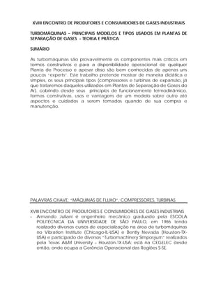 O documento discute as principais turbomáquinas usadas em plantas de separação de gases, especificamente compressores e turbinas de expansão. Explica os princípios de funcionamento destas máquinas, seus tipos, aplicações e aspectos construtivos.