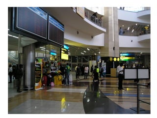 O documento discute o planejamento e a infraestrutura do turismo na Copa do Mundo de 2010 na África do Sul, incluindo receptivo de turistas, opções de lazer, cidades-sede, aeroportos, transporte público, eventos de fãs e impressões gerais sobre o evento.