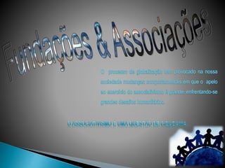 O documento descreve várias associações em Portugal, incluindo suas finalidades e websites. Aborda a Fundação Luso-Americana, Fundação Calouste Gulbenkian, Fundação da Juventude, Associação Portuguesa de Famílias Numerosas e outras.