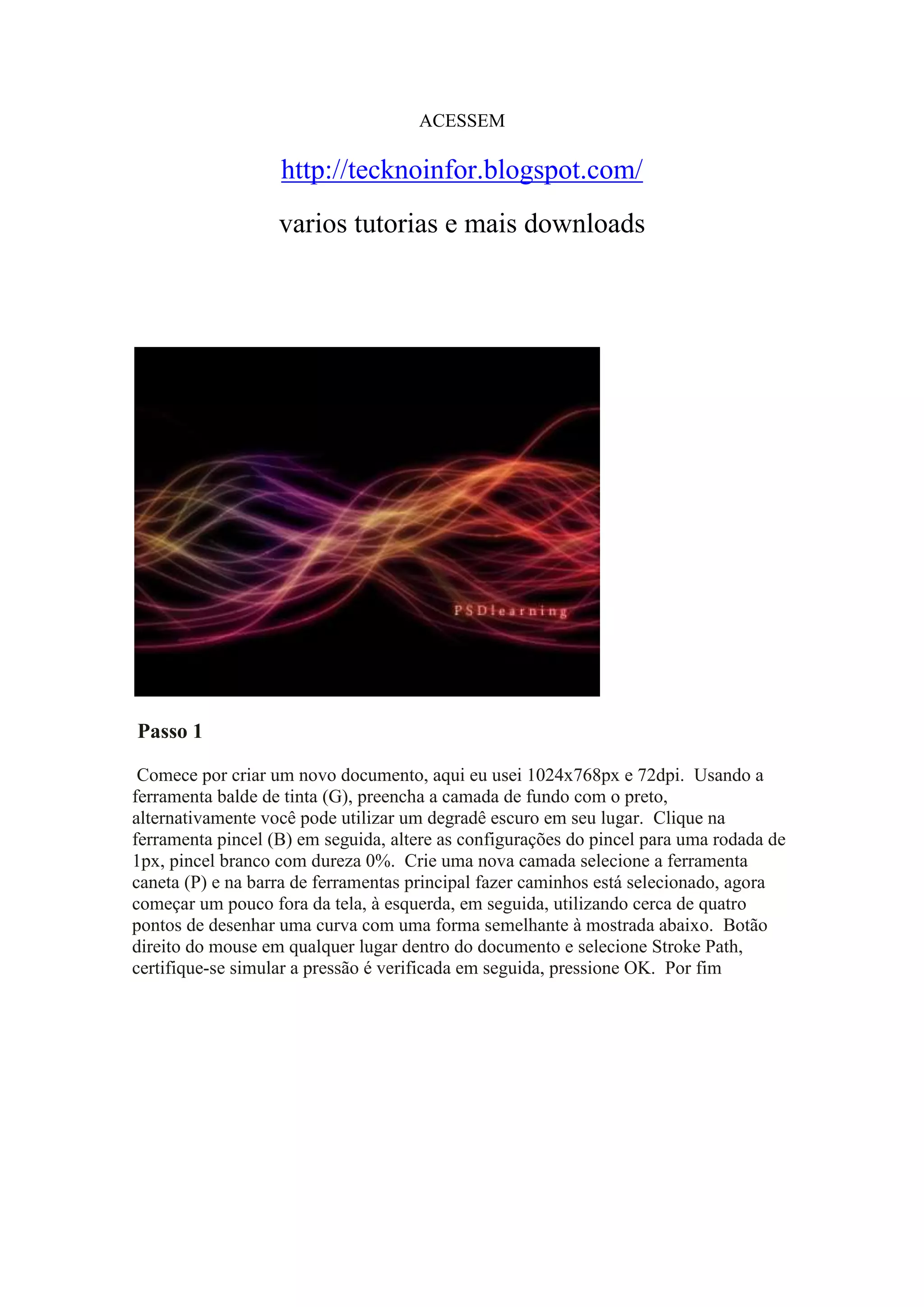 Este documento fornece instruções passo-a-passo para criar um efeito de linha colorida e brilhante em Photoshop. As etapas incluem preencher o fundo de preto, criar uma escova personalizada, desenhar linhas coloridas com variações de ângulo e forma, adicionar efeitos de sombra e brilho externos, duplicar a camada para obter dois conjuntos de linhas com gradientes diferentes e opcionalmente misturar algumas extremidades. Posteriormente, adicionar contas às linhas e aplicar form