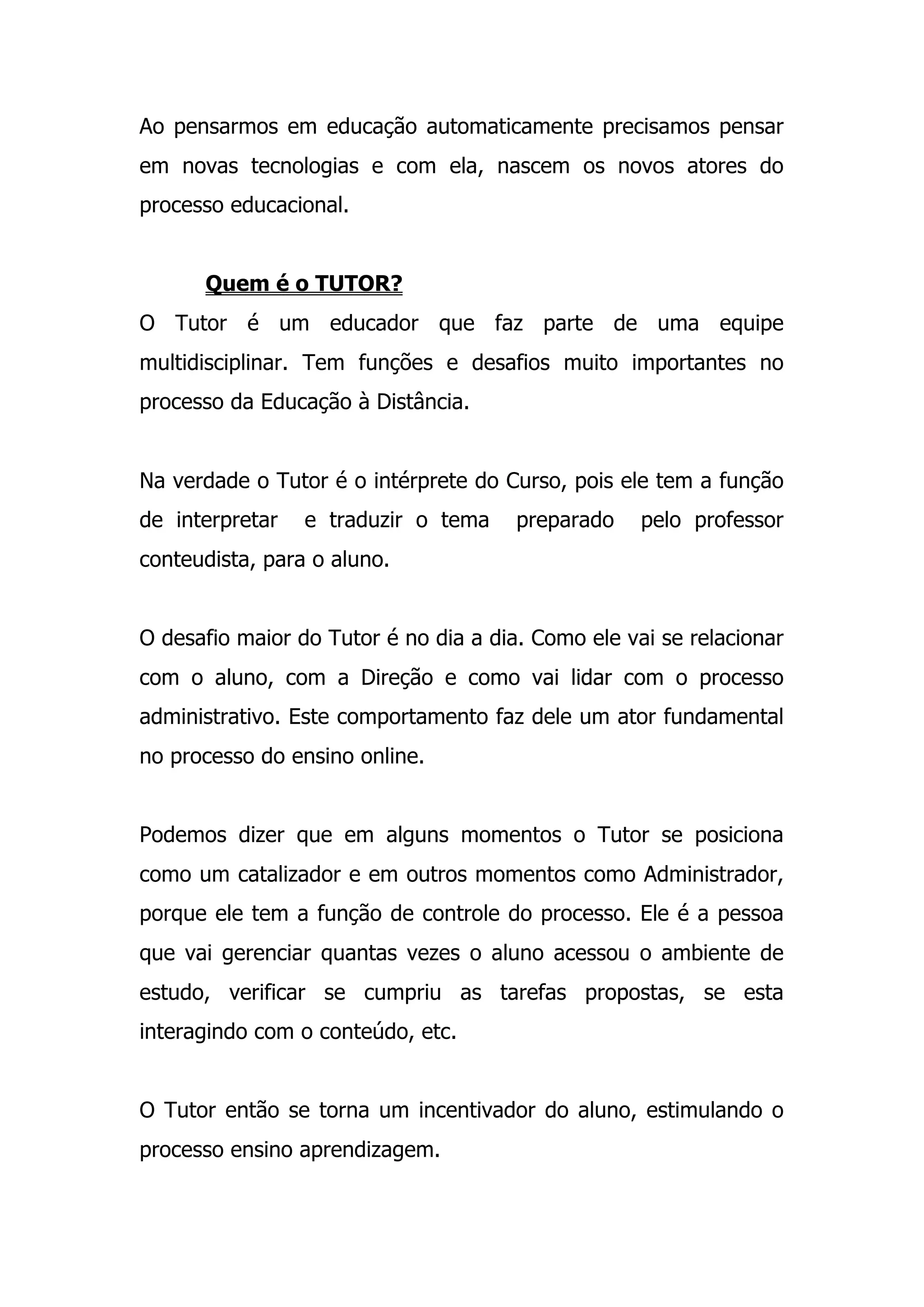 O documento discute o papel do tutor na educação a distância. O tutor é um educador que faz parte de uma equipe multidisciplinar e interpreta o conteúdo para os alunos. O desafio do tutor é se relacionar com os alunos e gerenciar o processo administrativo de forma a manter os alunos motivados.