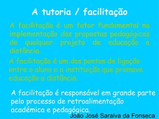 O documento discute o papel do tutor na educação a distância. Ele descreve que o tutor é responsável pela implementação das propostas pedagógicas, pela interação entre alunos e instituição, e por fornecer orientação, mediação e ajuda aos alunos. O documento também lista várias atribuições do tutor, como conhecer o material didático, detectar problemas dos alunos, motivar os alunos e participar da avaliação do curso.