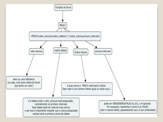 O documento explica a função PROCV do Excel, que localiza um valor em uma coluna de uma tabela e retorna um valor de outra coluna da mesma linha. A função requer como parâmetros o valor procurado, a matriz da tabela, o número da coluna de retorno e um parâmetro para procurar valores aproximados. Exemplos demonstram como usar a função PROCV para encontrar o nome de um funcionário a partir de seu código.