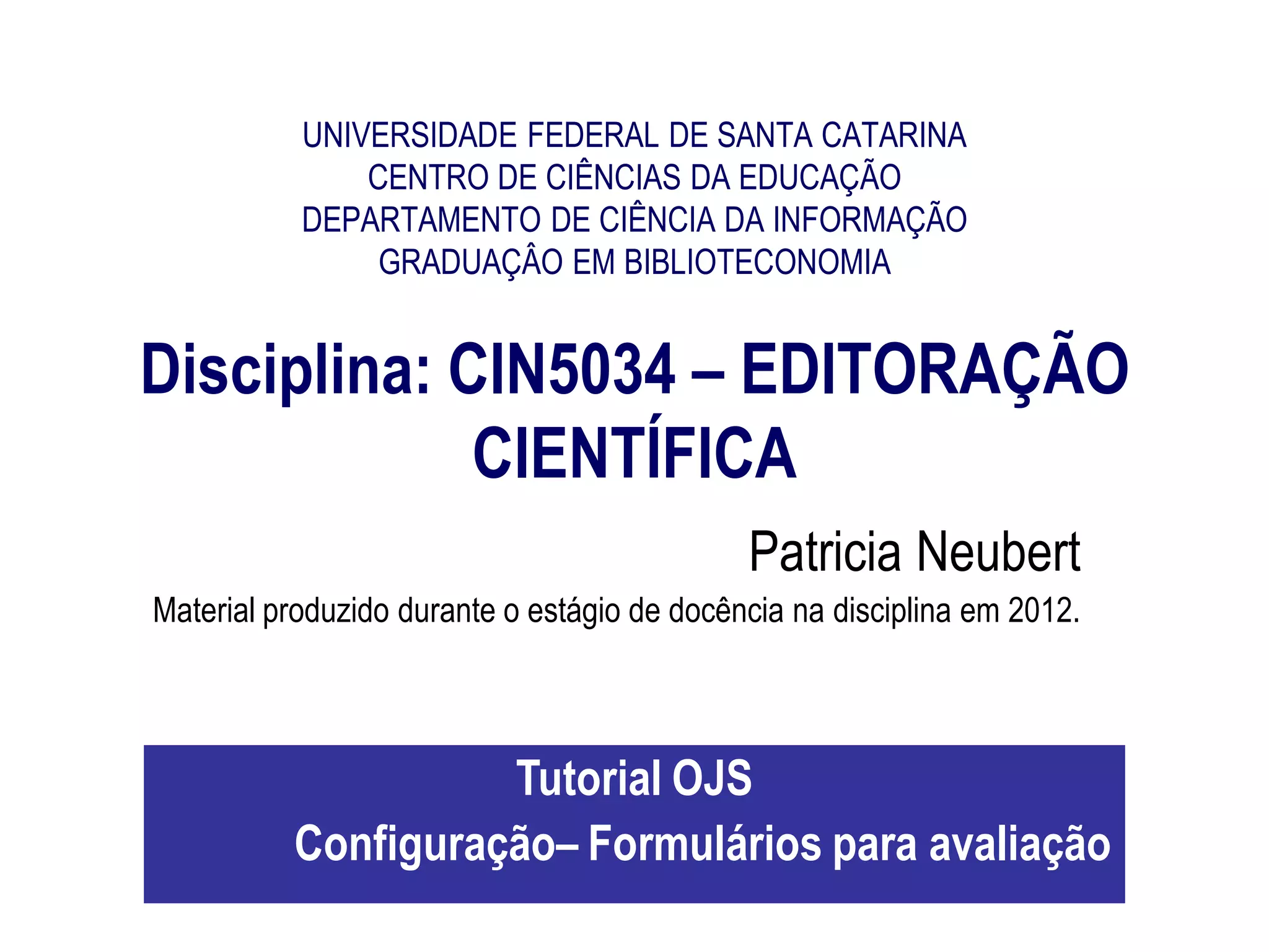 Este documento fornece instruções passo a passo sobre como configurar formulários de avaliação no Open Journal Systems (OJS) para avaliar artigos submetidos a uma revista. Ele explica como criar novos formulários, adicionar campos de perguntas e vincular os formulários às seções corretas da revista.
