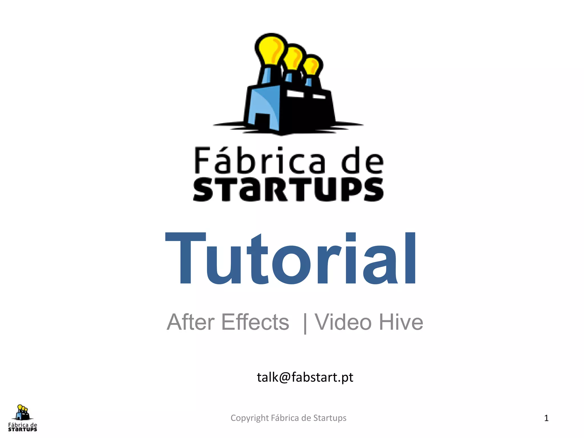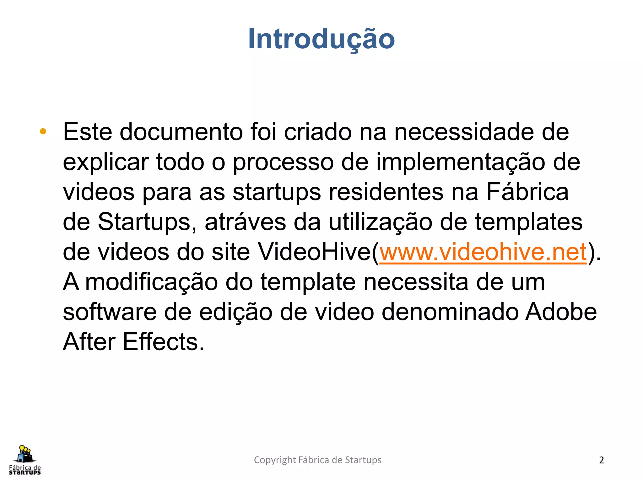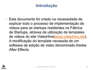 Este documento fornece instruções sobre como startups residentes na Fábrica de Startups podem modificar templates de vídeo comprados no site VideoHive usando o software Adobe After Effects. Explica o processo de aquisição do template, introduz conceitos básicos do After Effects e fornece um exemplo prático de como personalizar um template para a Fábrica de Startups.