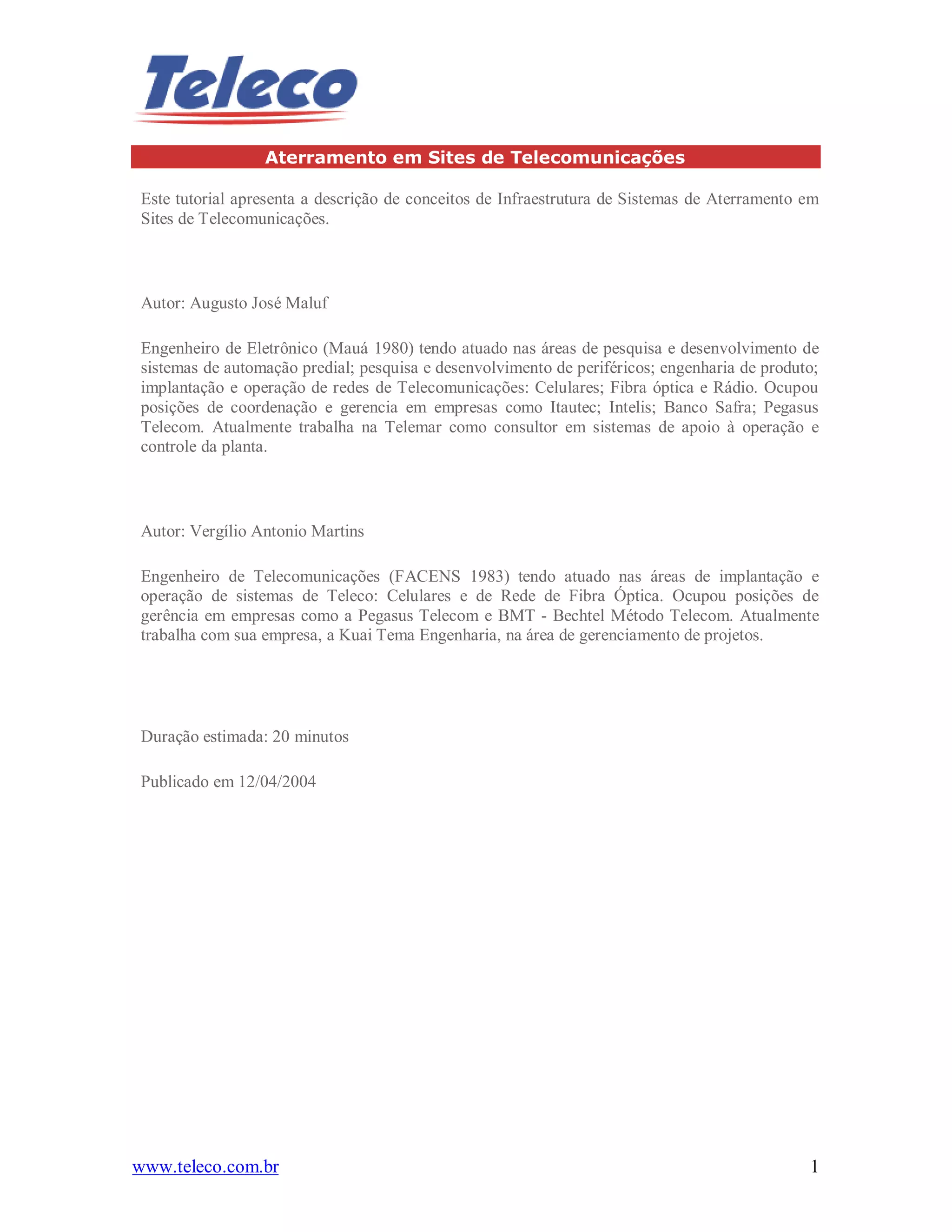 Este documento descreve conceitos de sistemas de aterramento em sites de telecomunicações, incluindo: 1) o objetivo de sistemas de aterramento de fornecer segurança contra descargas elétricas e proteção de equipamentos; 2) os principais componentes de sistemas de aterramento como pára-raios, eletrodos de terra e poços de inspeção; 3) as características técnicas destes componentes.