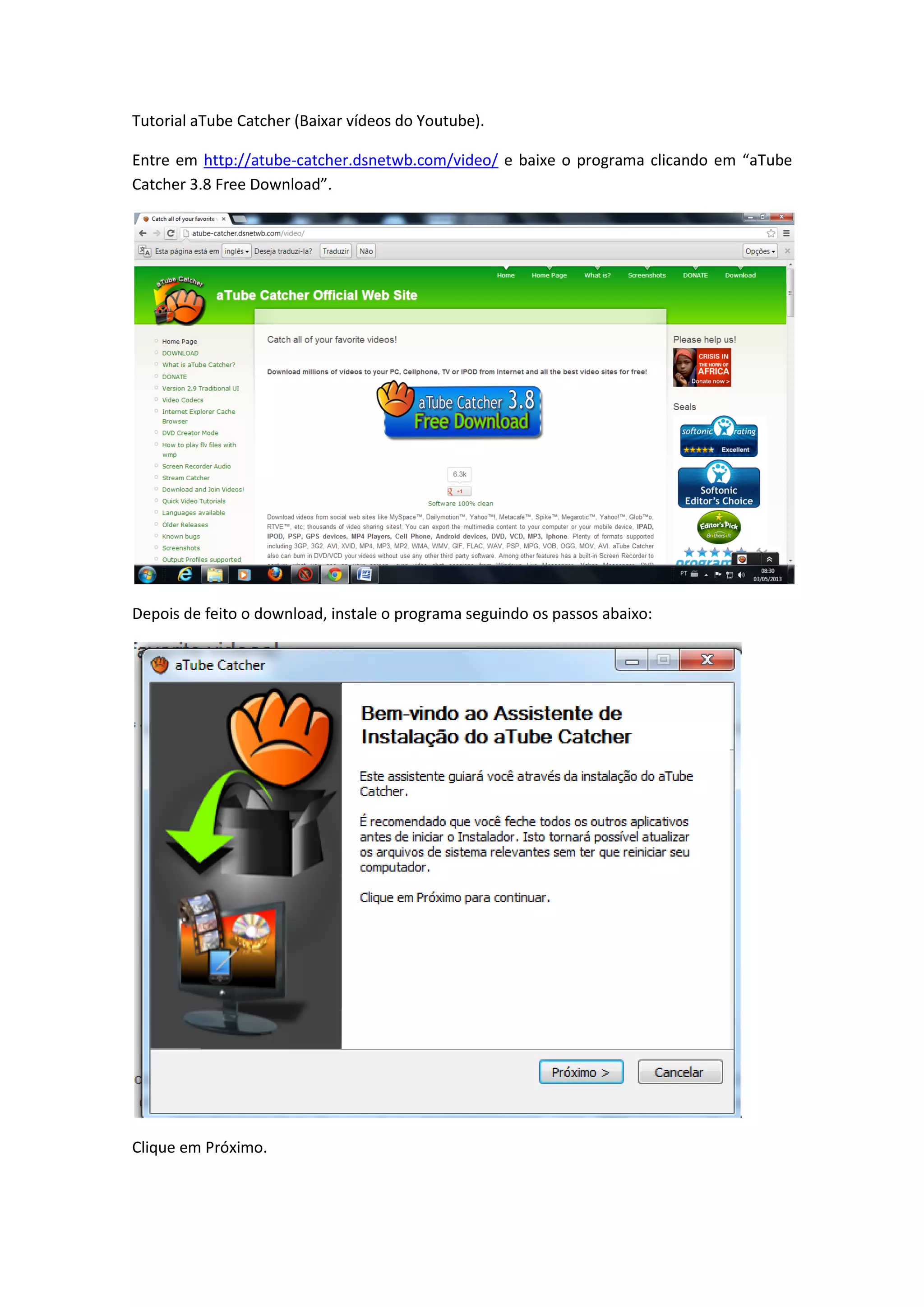Este documento fornece instruções passo a passo para baixar e instalar o programa aTube Catcher para baixar vídeos do YouTube. Após a instalação, explica como pesquisar um vídeo no YouTube, copiar seu link e colá-lo no programa para iniciar o download.