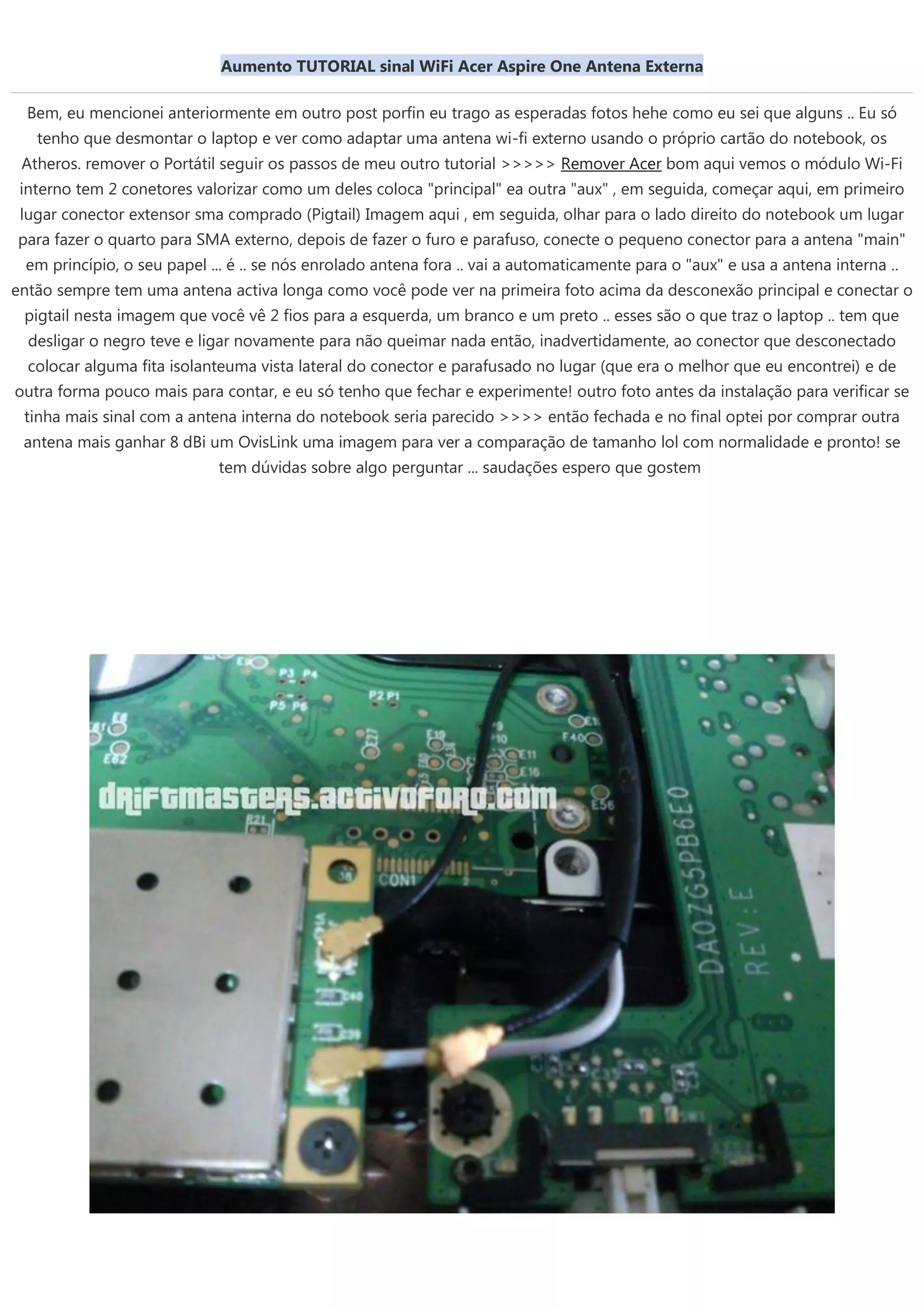 Este documento fornece instruções passo a passo para adicionar uma antena Wi-Fi externa ao Acer Aspire One usando o cartão de rede interno. Ele descreve como remover o módulo Wi-Fi, conectar um pigtail SMA e fixá-lo no laptop para fornecer uma conexão externa. Também recomenda comprar uma antena externa com ganho maior para melhorar ainda mais o sinal sem fio.