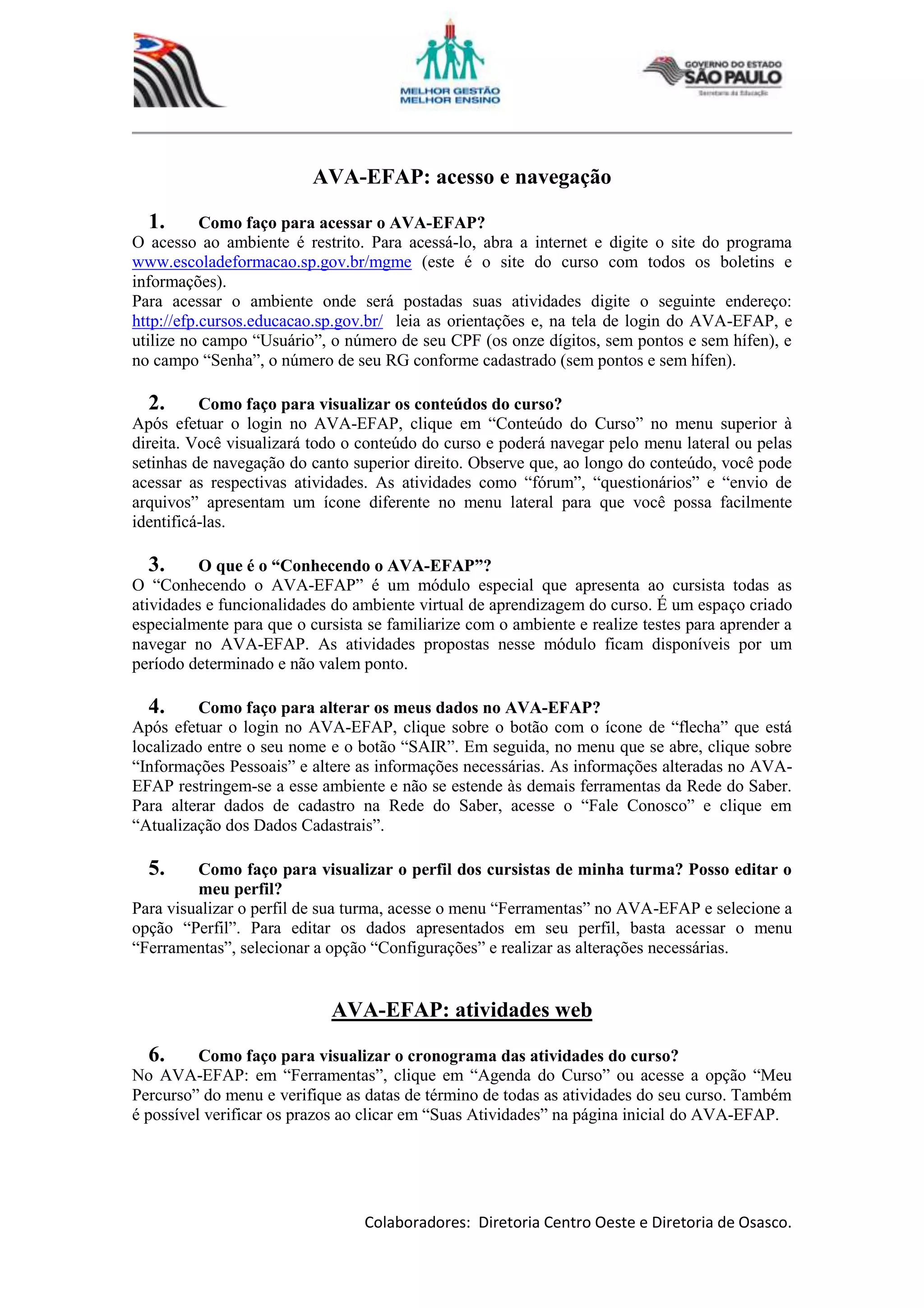 O documento fornece instruções sobre como acessar e navegar no ambiente virtual de aprendizagem AVA-EFAP, incluindo como acessar conteúdos, visualizar o cronograma de atividades, responder e refazer questões objetivas e discursivas.