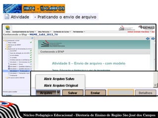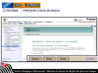 Este documento fornece instruções sobre como acessar e navegar no Ambiente Virtual de Aprendizagem (AVA) da Escola de Formação e Aperfeiçoamento do Professor (EFAP). Ele explica como os usuários podem entrar no sistema usando seu CPF e senha, selecionar cursos, preencher seus perfis, acessar conteúdos do curso como vídeos e textos, realizar atividades, e obter devolutivas dos tutores.