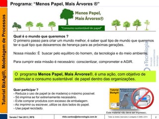 O tutorial Bizagi® descreve a modelagem de processos de negócios usando a notação BPMN, enfatizando a importância de escolher a ferramenta adequada para maximizar a eficiência. Ele apresenta o Bizagi Process Modeler como uma opção gratuita que facilita a modelagem, documentação e publicação de processos. Além disso, o material promove a conscientização sobre o consumo sustentável de papel dentro das organizações.