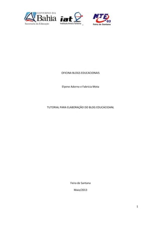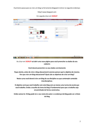 O documento é um tutorial sobre como criar um blog educacional na plataforma Blogspot, abordando desde o cadastro até a personalização do blog. Os autores recomendam definir objetivos claros para o blog e sugerem interatividade com alunos durante o uso. Além disso, são apresentados conceitos como 'gadget' e 'widget', que enriquecem a funcionalidade do blog.