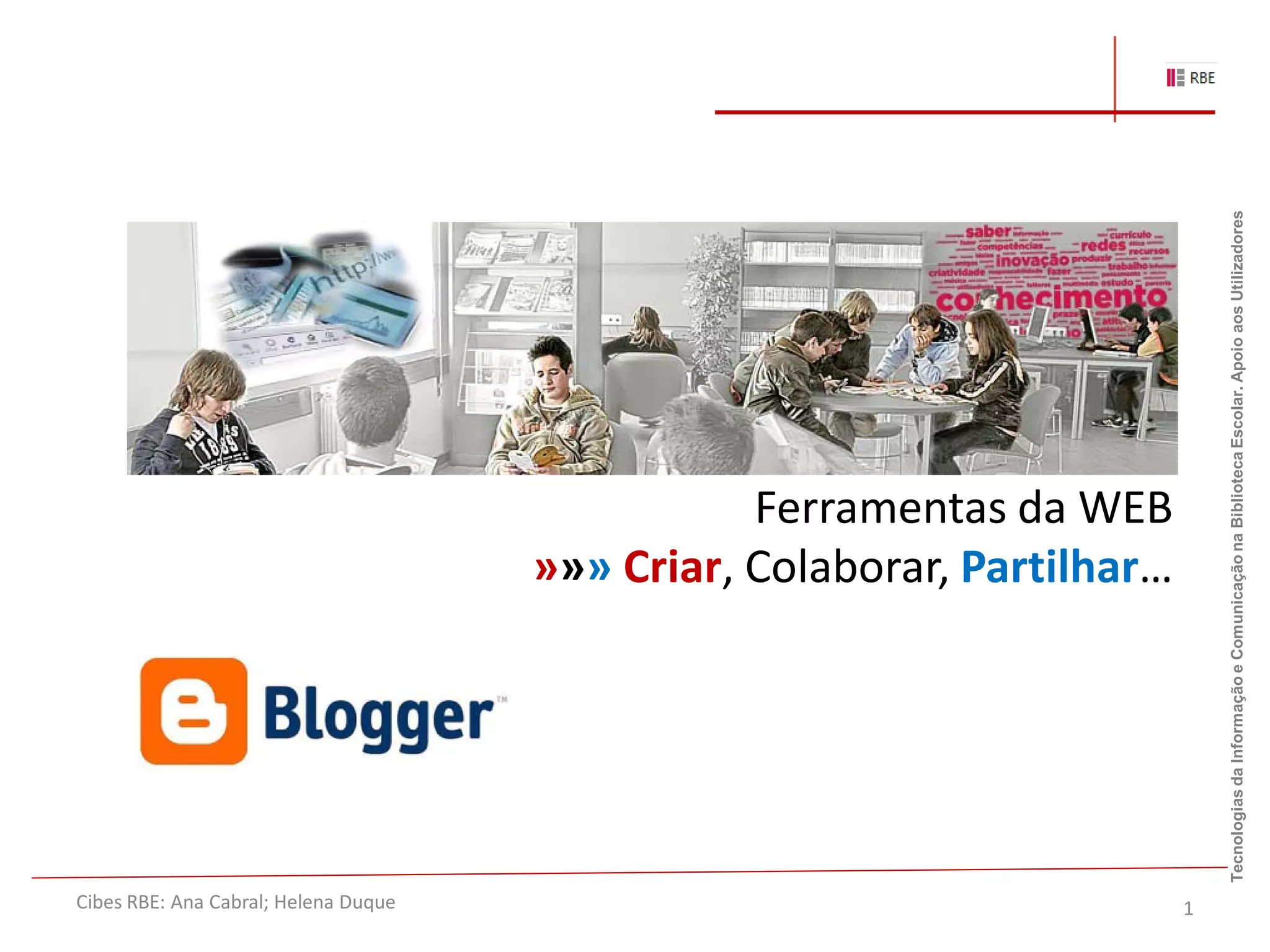 Este documento fornece instruções passo-a-passo sobre como criar e personalizar um blogue usando a plataforma Blogger. Ele explica como criar uma conta no Blogger, configurar um blogue recém-criado alterando o layout e definições, escrever postagens com imagens e hiperlinks, e incorporar aplicações como apresentações Picasa.