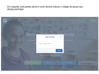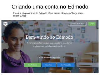 O documento orienta sobre como criar uma conta no Edmodo, iniciando pela página inicial onde se deve clicar em 'faça parte de um grupo' para inserir o código do grupo desejado. Alunos podem criar contas sem email, enquanto professores precisam fornecer um email e senha. Após preencher os campos solicitados, a conta é criada.