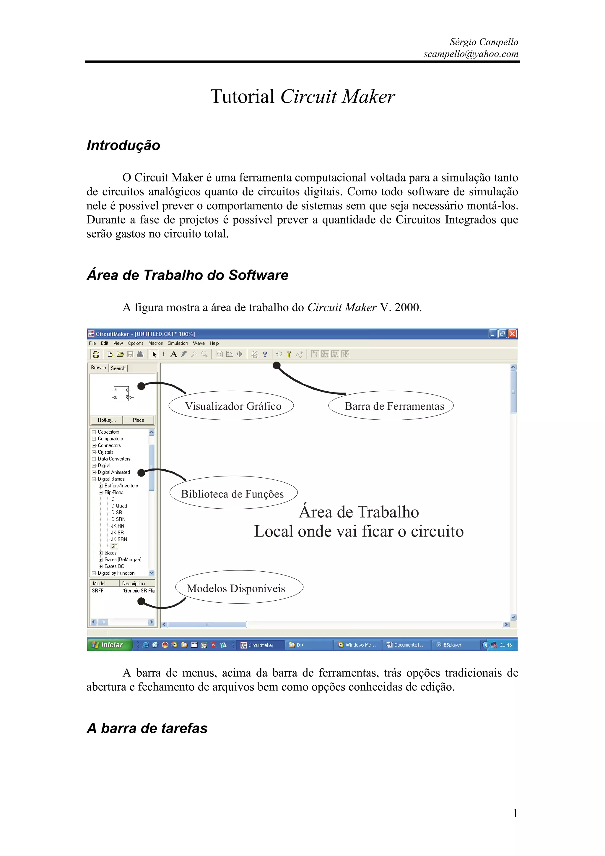 O documento descreve o software Circuit Maker, que permite simular circuitos analógicos e digitais. Ele apresenta as principais ferramentas do software, como a barra de ferramentas, biblioteca de componentes e como montar e simular circuitos digitais. O documento também explica como criar macros personalizadas para modularizar circuitos maiores.