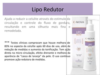O documento discute produtos cosméticos para redução de celulite e flacidez da pele. Ele fornece detalhes sobre a definição de celulite, testes clínicos que mostraram melhora na aparência da celulite após uso contínuo de produtos, as principais áreas do corpo afetadas pela celulite, e descrições de vários cremes e géis projetados para melhorar a circulação, tonificar a pele e reduzir a aparência de celulite e flacidez.