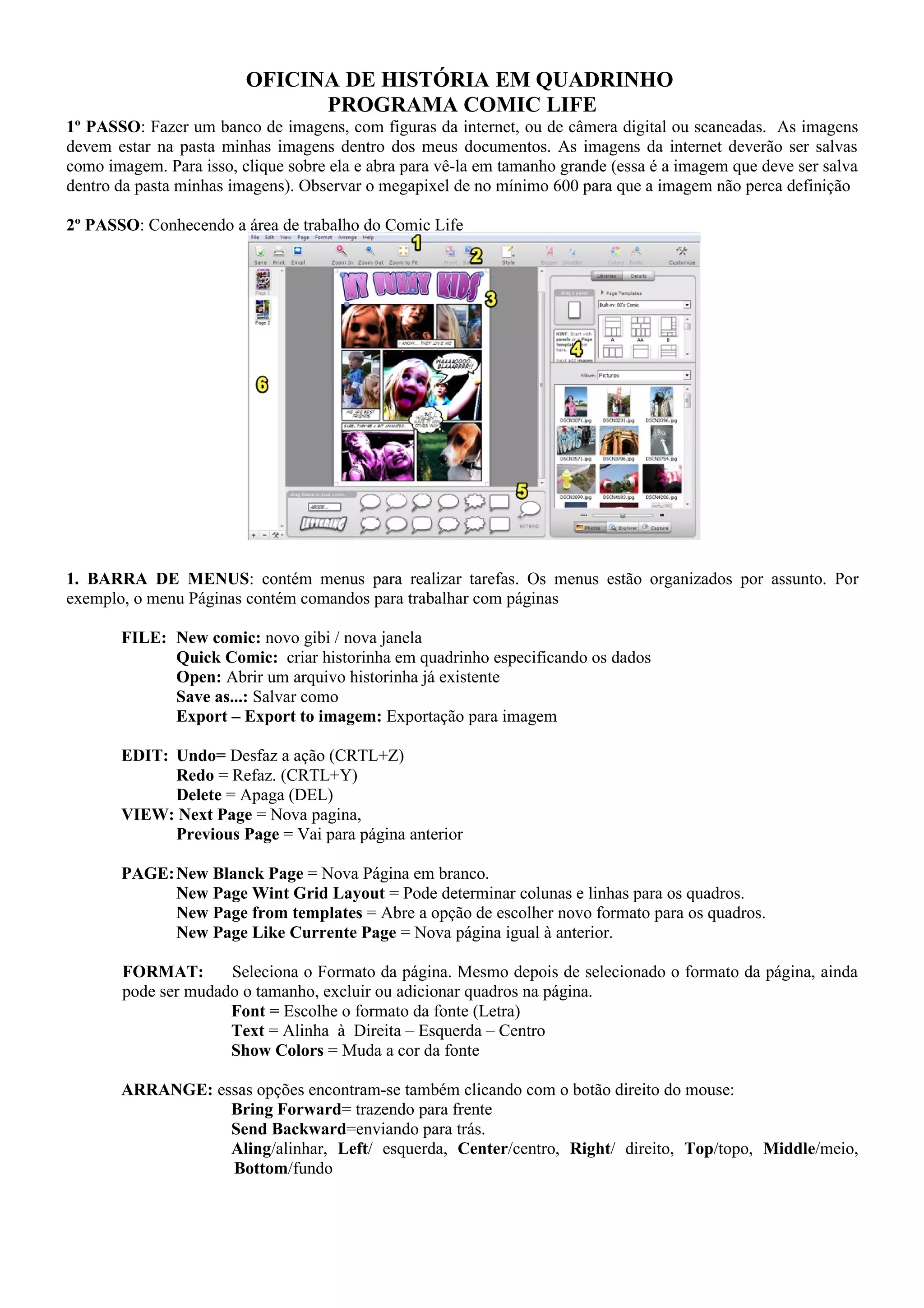 Este documento fornece instruções sobre como criar uma história em quadrinhos usando o programa Comic Life. Ele explica como fazer um banco de imagens, conhecer a interface do usuário, adicionar imagens, balões de diálogo e legendas para compor as páginas. O objetivo é ensinar os estudantes a construir uma história visual passo a passo usando ferramentas básicas do aplicativo.