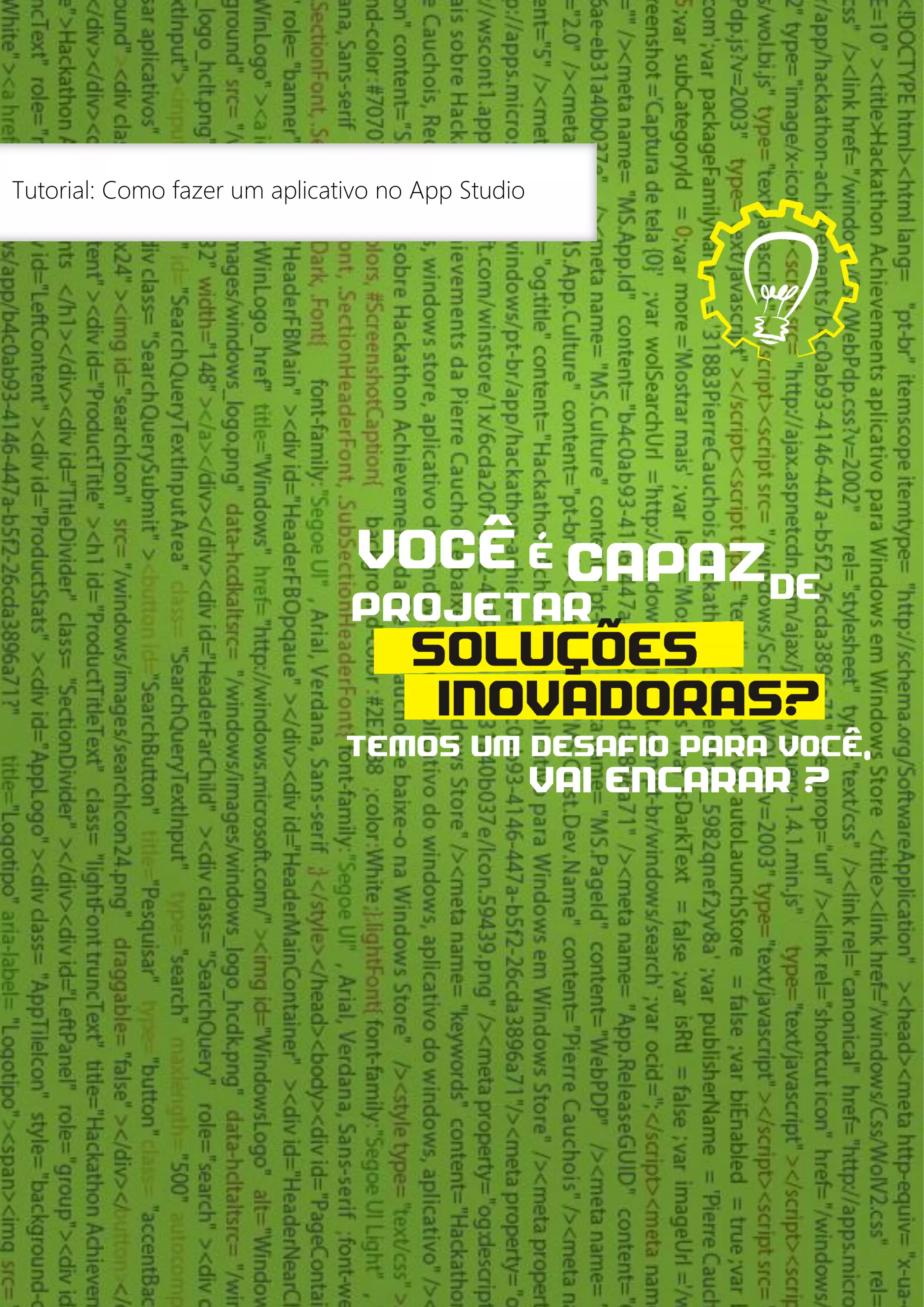 Este documento fornece um tutorial passo a passo sobre como criar um aplicativo no App Studio, incluindo escolher um modelo, adicionar conteúdo, escolher um estilo e publicar. Explica os diferentes componentes básicos e avançados que podem ser adicionados e fornece exemplos de como personalizar o aplicativo.