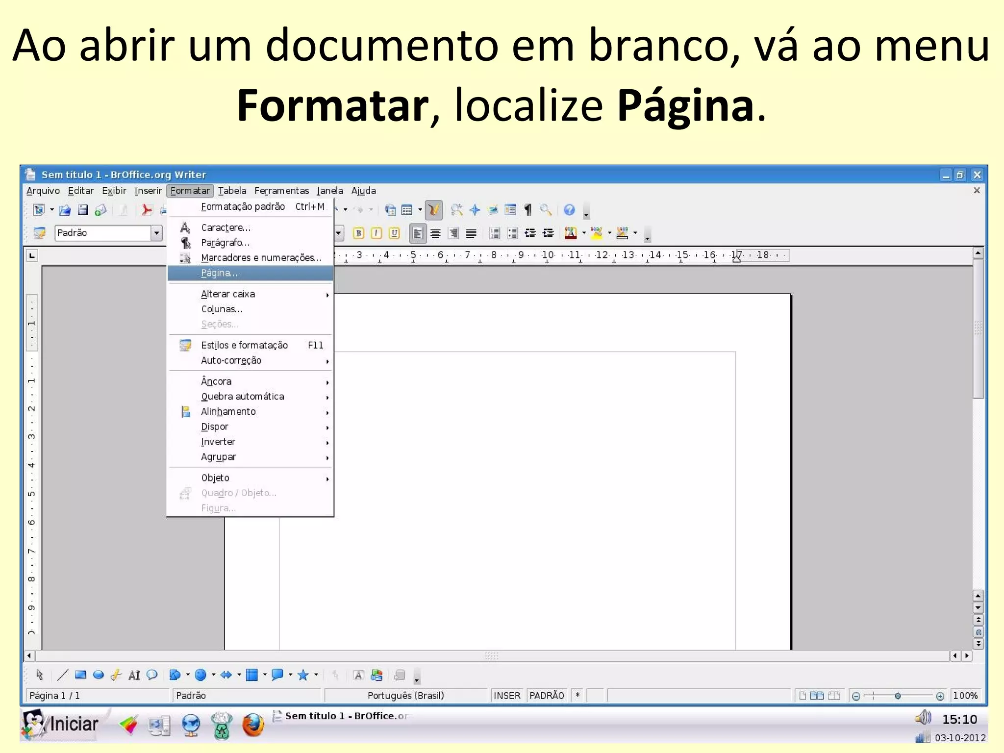 O documento fornece instruções para criar um folder no Linux Educacional em 3 etapas: 1) formatar a página para o formato paisagem com margens de 0,60, 2) dividir a página em colunas usando a aba Colunas, 3) inserir quebras de coluna para preencher cada coluna. O folder deve ser confeccionado iniciando a primeira página da direita para a esquerda e a segunda da esquerda para a direita.