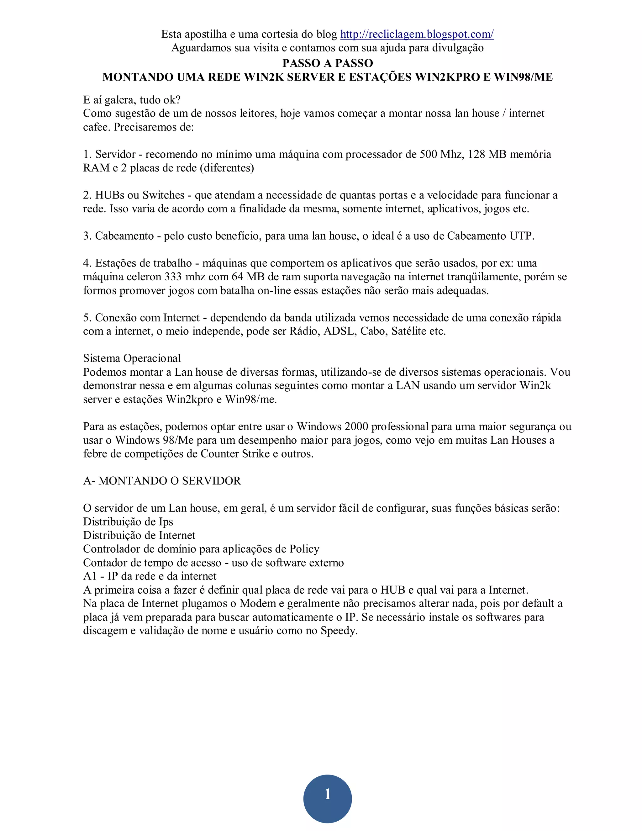 1) O documento fornece instruções passo a passo para configurar uma rede local (LAN) com um servidor Windows 2000 e estações Windows 2000 e Windows 98/ME.