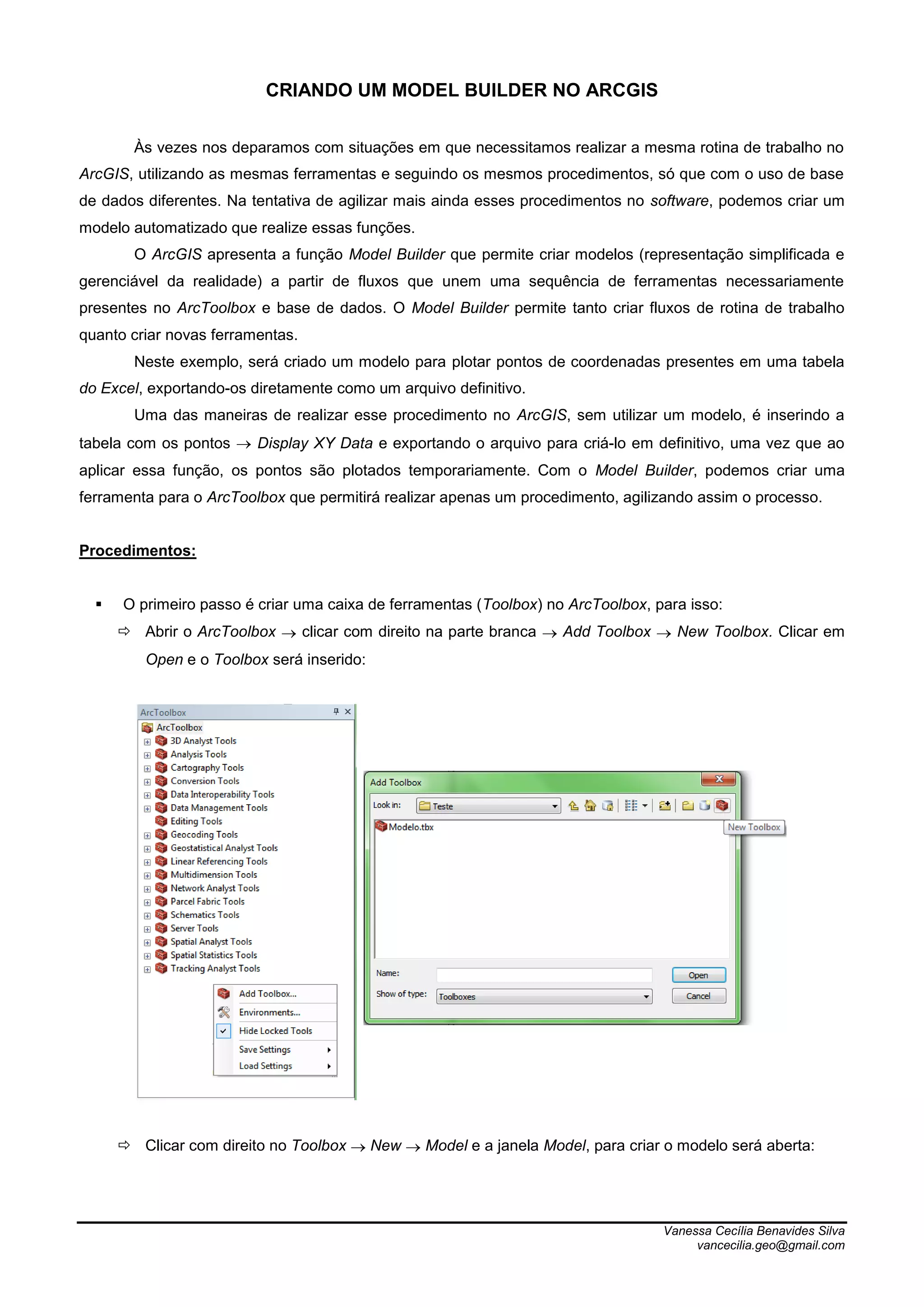 O documento aborda a criação de um modelo automatizado no ArcGIS utilizando a função Model Builder, que permite otimizar rotinas de trabalho com diferentes bases de dados. O autor explica como criar uma toolbox e um modelo para plotar pontos de coordenadas de uma tabela do Excel e exportá-los como um arquivo definitivo. Também são mencionados os tipos de modelos (fechados e abertos) e a definição de parâmetros para facilitar a manipulação dos dados.