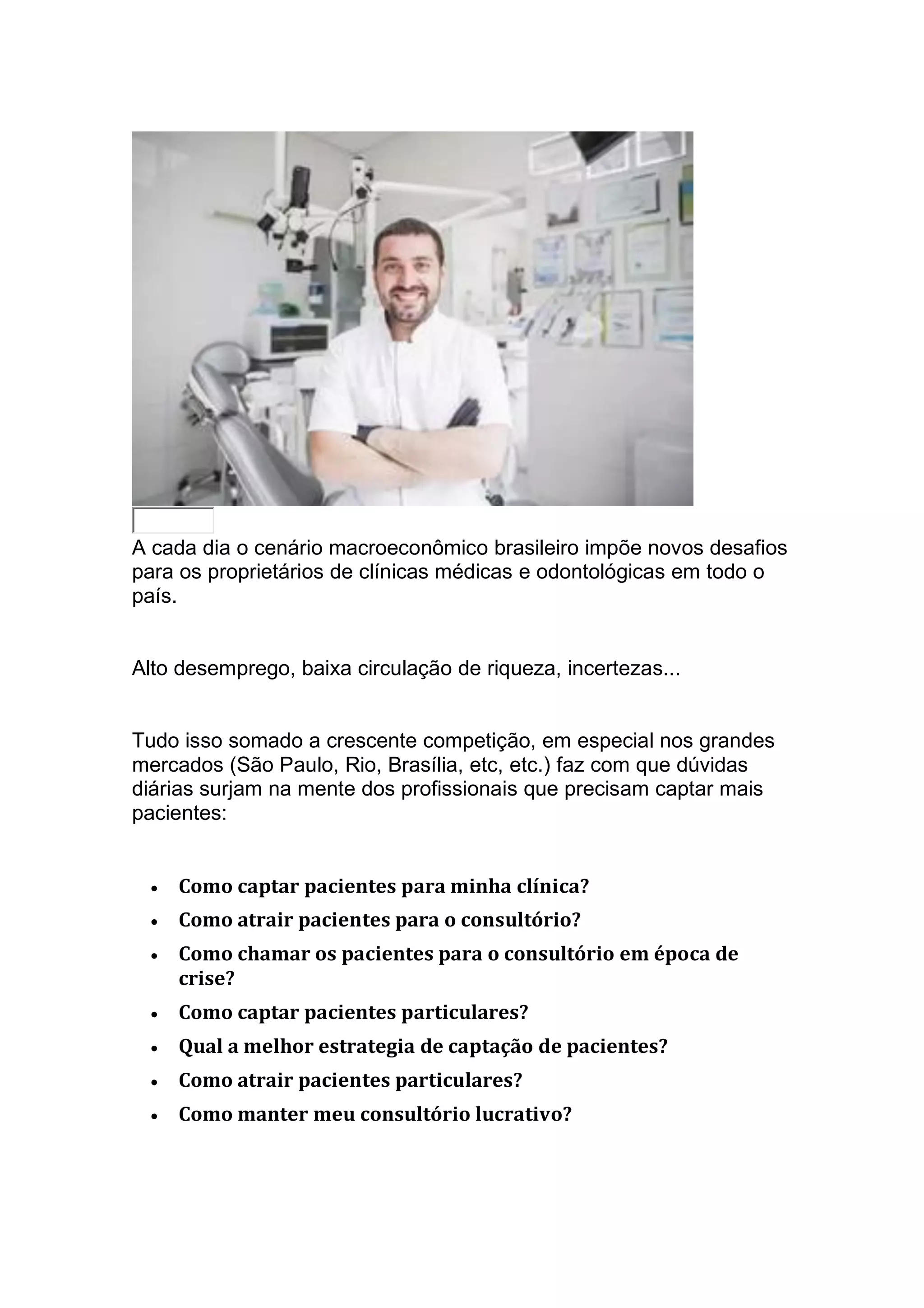 O documento aborda os desafios enfrentados por clínicas médicas e odontológicas no Brasil durante a crise econômica e a pandemia de coronavírus, destacando a necessidade de estratégias eficazes para captação de pacientes. Apresenta um tutorial passo a passo que enfatiza a importância de segmentar o mercado, revisar os serviços oferecidos e fortalecer a presença digital, além de sugerir métodos de captação fora do ambiente digital. O foco é garantir que as clínicas se reposicionem para atrair pacientes que buscam procedimentos estéticos e de alto valor.