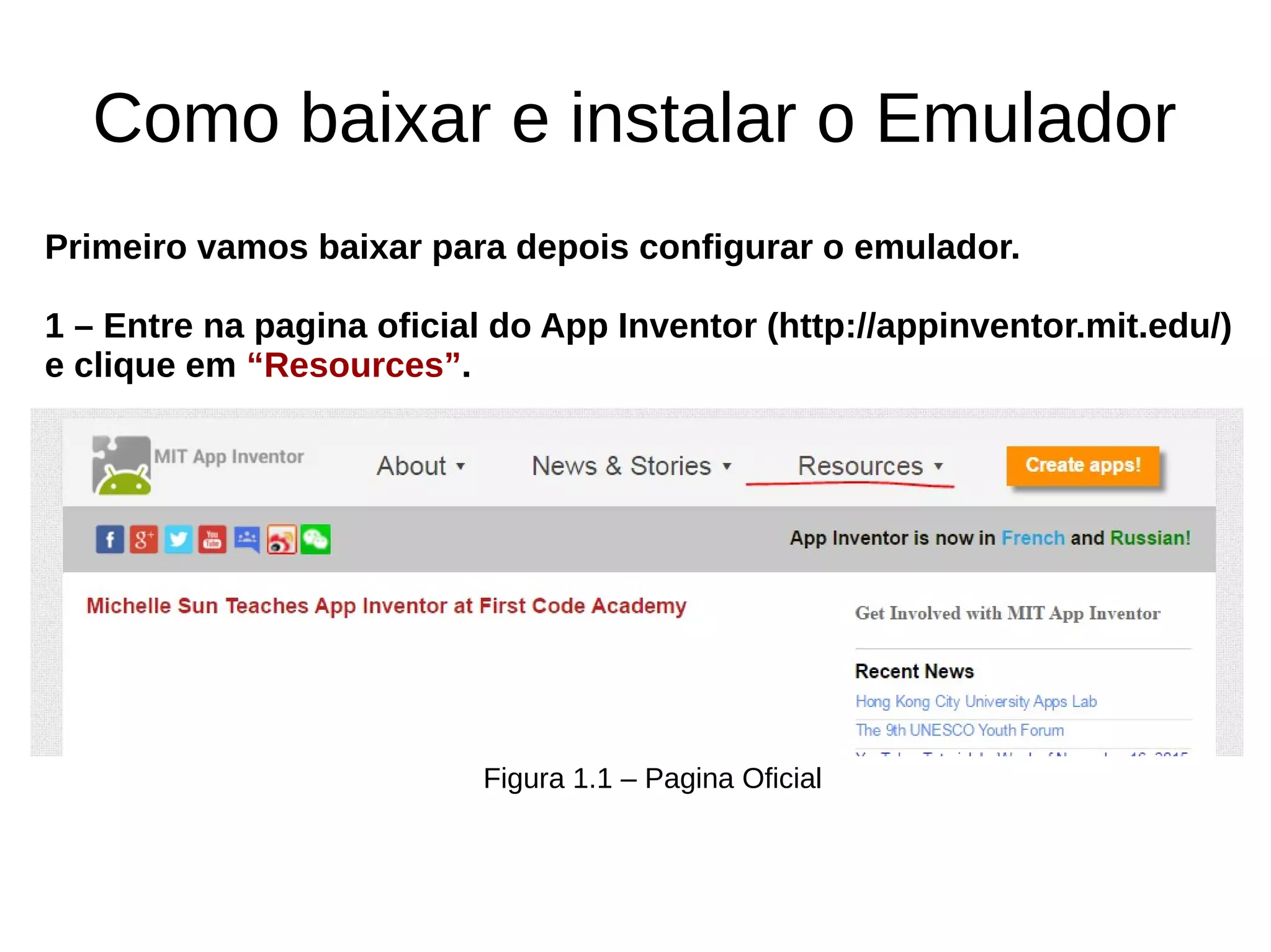 Este documento fornece instruções passo-a-passo para baixar e instalar o emulador App Inventor, incluindo acessar o site oficial, baixar e executar o instalador, e configurar o emulador para rodar aplicativos dentro do computador.