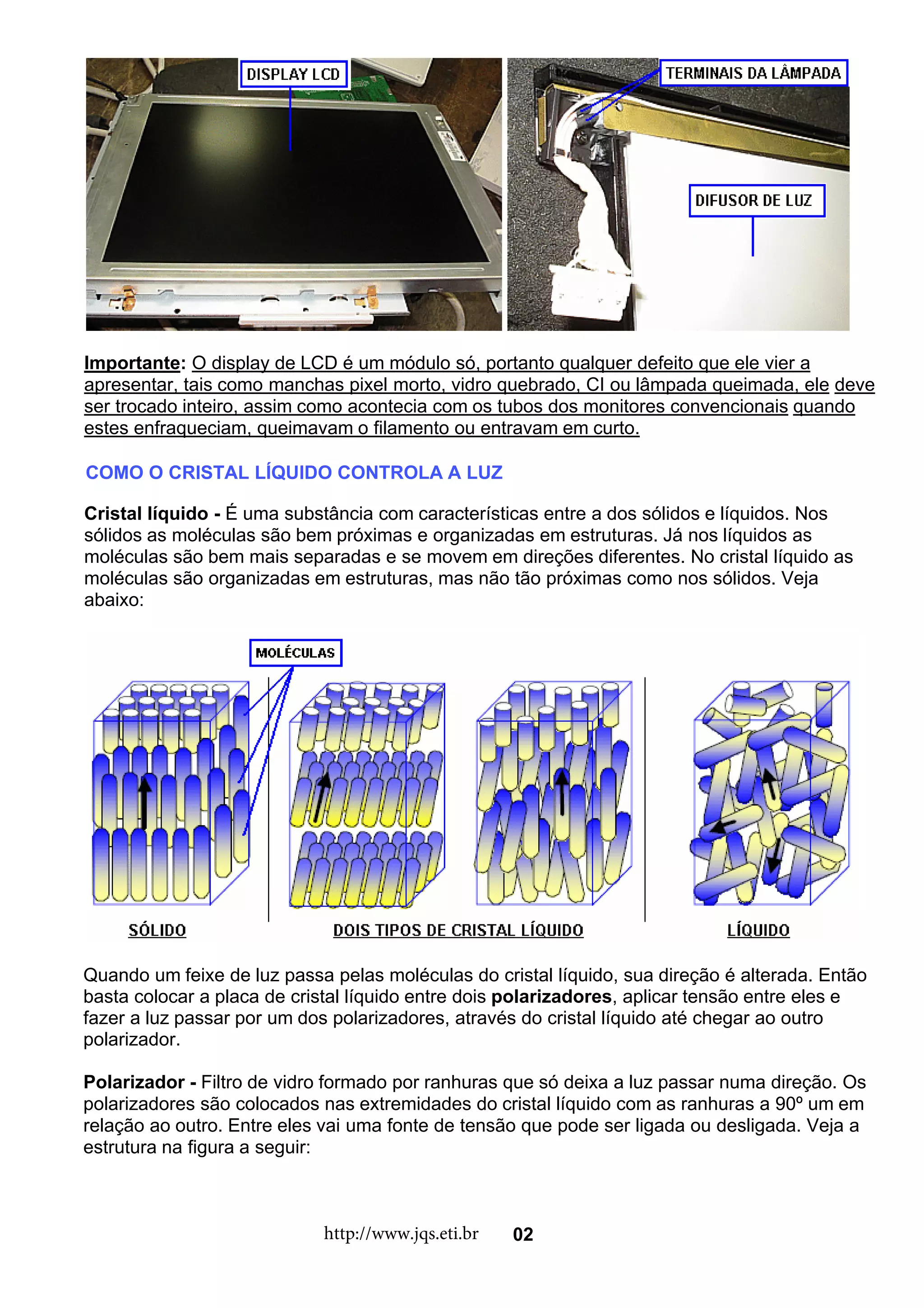 O documento fornece um tutorial sobre monitores LCD, explicando seu funcionamento e técnicas de manutenção. Descreve as principais partes de um monitor LCD, incluindo a tela de cristal líquido, os transistores TFT, os polarizadores e a iluminação CCFL. Também explica como os pixels são controlados para exibir imagens e como reparar defeitos comuns.