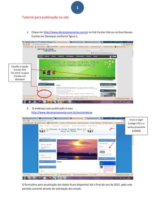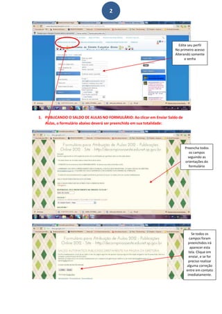 1. O documento fornece instruções para que escolas publiquem seus horários e saldos de aulas no site da Secretaria de Educação.