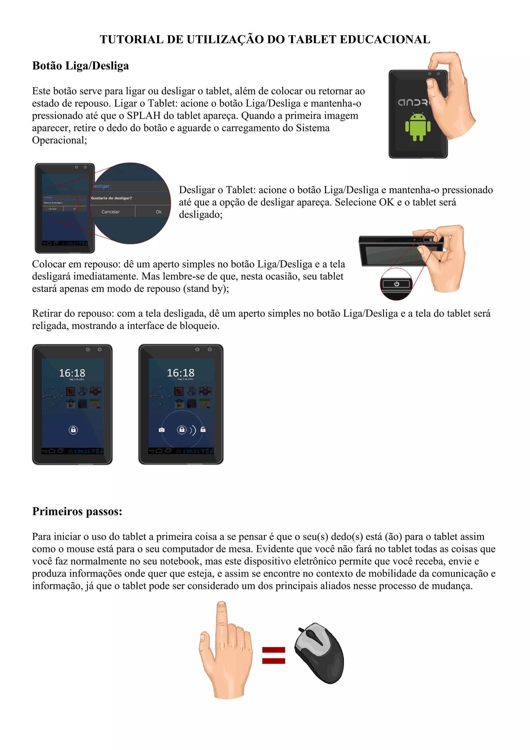 Este documento fornece instruções sobre como usar as principais funções de um tablet educacional, incluindo como ligá-lo e desligá-lo, navegar na tela touchscreen, ajustar o volume, conectar-se à internet via Wi-Fi ou Bluetooth, acessar configurações, aplicativos e contas de e-mail, tirar fotos e gravar vídeos e áudio.