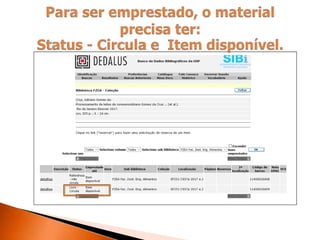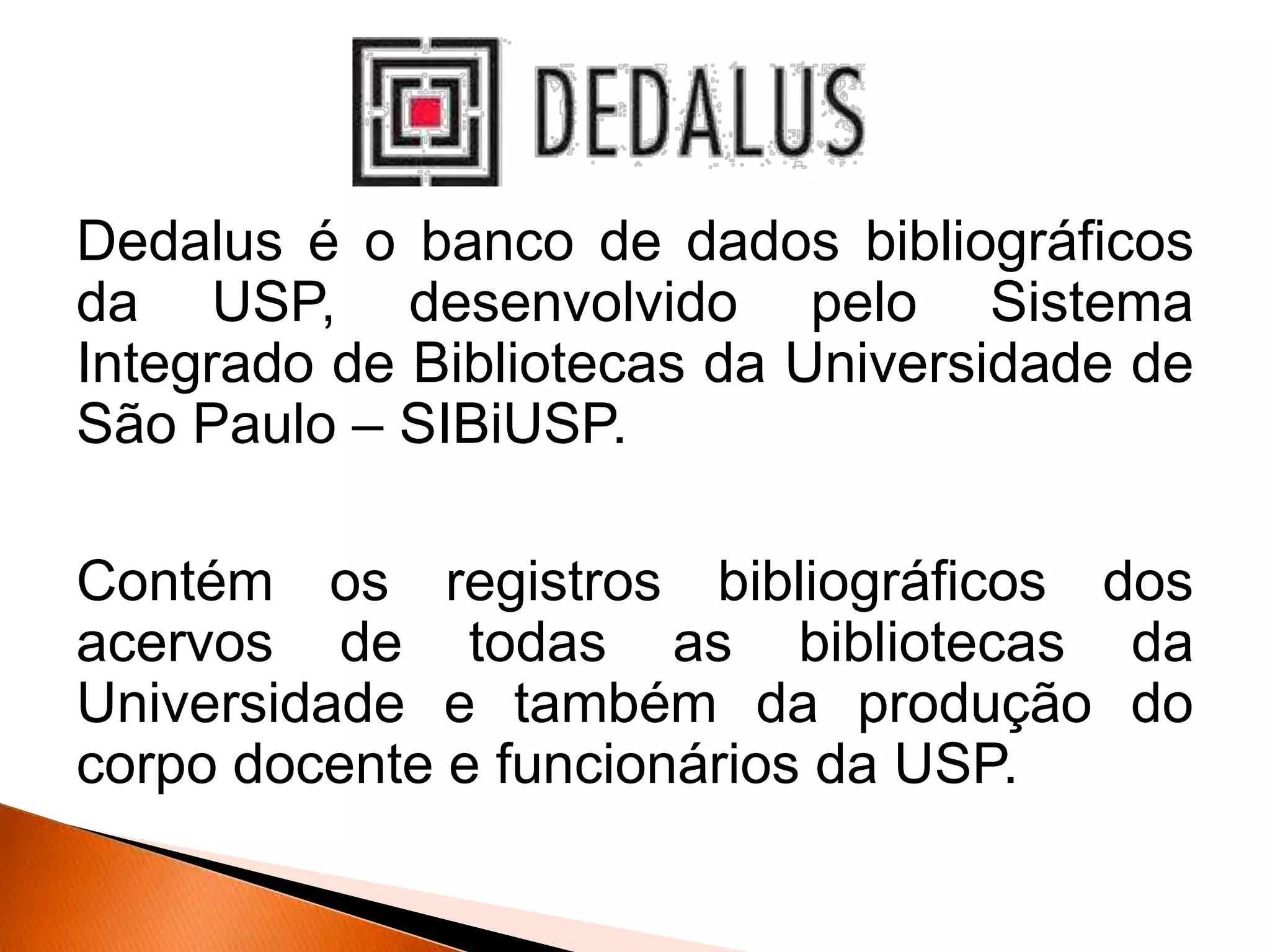Dedalus é o banco de dados bibliográficos da USP que contém os registros das bibliotecas da universidade e da produção acadêmica, permitindo pesquisar os acervos e localizar materiais. O site fornece ferramentas para buscar, renovar empréstimos, reservar itens e acompanhar empréstimos.