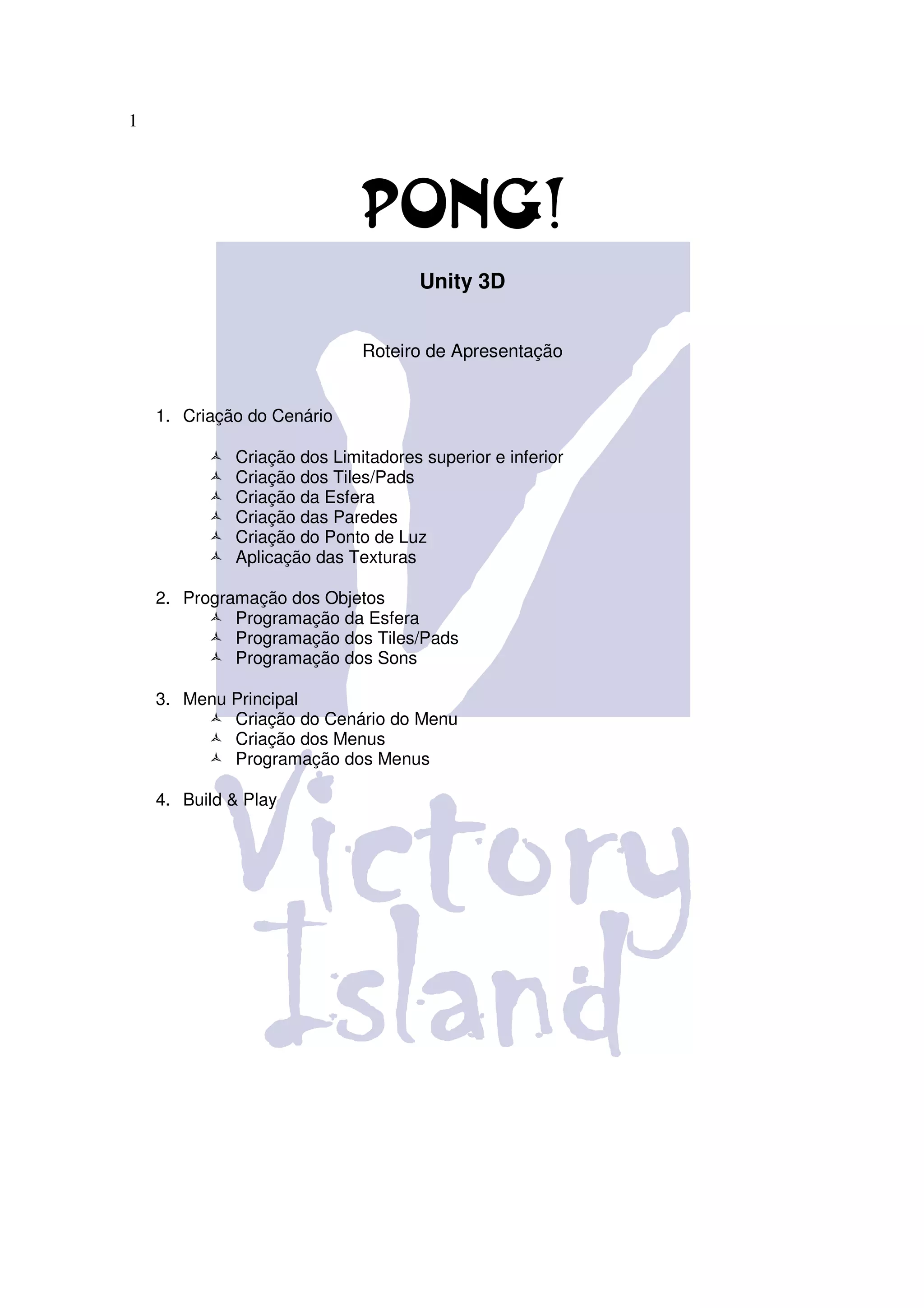 Este documento apresenta os passos para criar um jogo Pong no Unity 3D, incluindo a criação do cenário com objetos como bolas, paddles e paredes, programação desses objetos para movimentação e física, desenvolvimento de um menu principal com botões interativos, e compilação do jogo para teste.