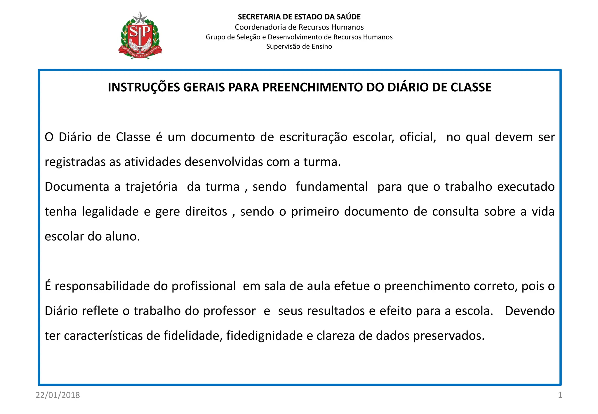 O diário de classe é um documento oficial que registra as atividades desenvolvidas com a turma, sendo essencial para a legalidade do trabalho escolar e o acompanhamento da vida do aluno. O preenchimento deve ser fiel e claro, com informações sobre frequência, conteúdo programático, avaliações e atividades diversas, além de seguir orientações específicas para evitar rasuras e manter a integridade dos registros. É responsabilidade do professor garantir que o diário reflita com precisão o trabalho realizado e deve ser arquivado após o término do curso.