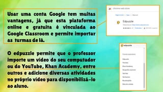 O documento descreve o Edpuzzle, uma ferramenta online gratuita para criar vídeo-aulas interativas. O Edpuzzle permite importar vídeos de sites como YouTube e adicionar atividades como questões, comentários de áudio e cortes de vídeo. Professores podem usar o Edpuzzle para criar aulas interativas e monitorar o desempenho dos alunos.
