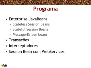 Este documento fornece um resumo introdutório sobre Enterprise JavaBeans 3.0, incluindo sessão beans, message-driven beans, transações e interceptadores. O programa abrange esses tópicos além de web services. O objetivo é fornecer uma introdução prática a EJB 3.0 com demonstrações.