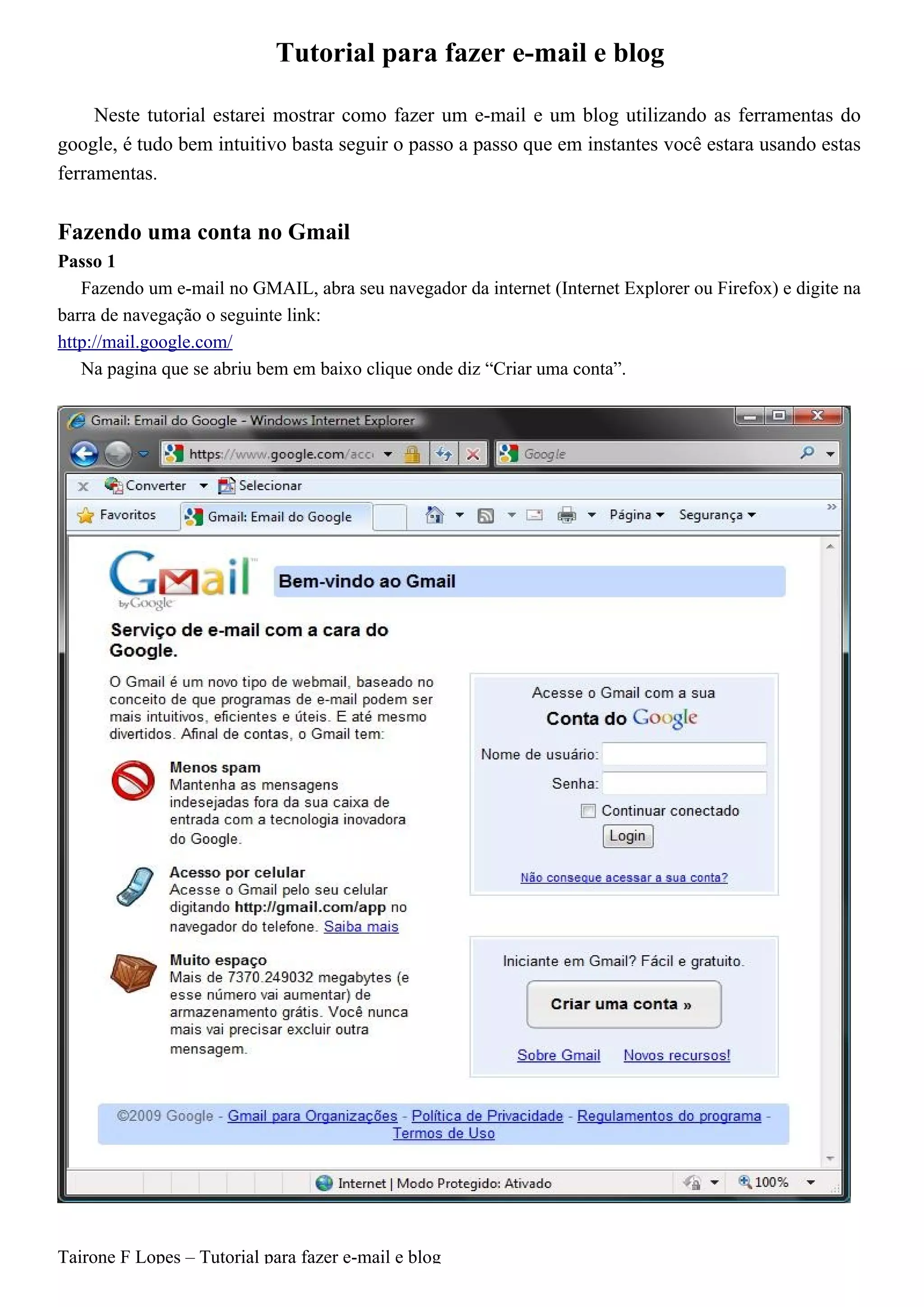 Este documento fornece um tutorial passo a passo para criar uma conta de e-mail no Gmail e um blog no Blogger. Explica como preencher os dados necessários para o e-mail e escolher o título e endereço do blog, além de mostrar como publicar posts no blog recém-criado.