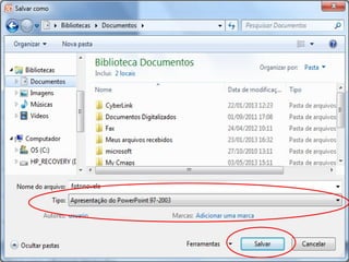 O documento fornece instruções sobre como inserir imagens de computador ou da internet em uma apresentação, adicionar balões de fala e salvar a apresentação ou como uma imagem. Explica como procurar, selecionar e copiar imagens e como formatar e escrever dentro dos balões de fala.