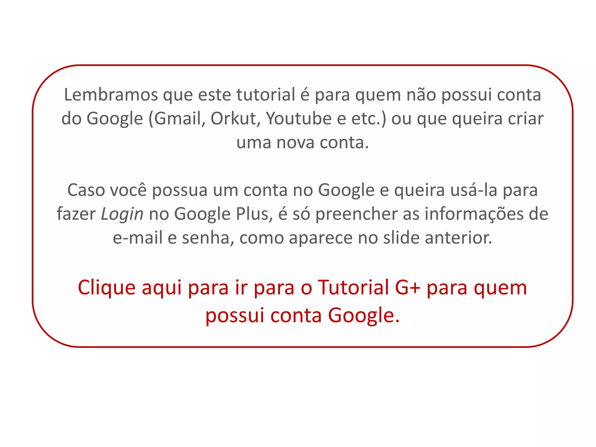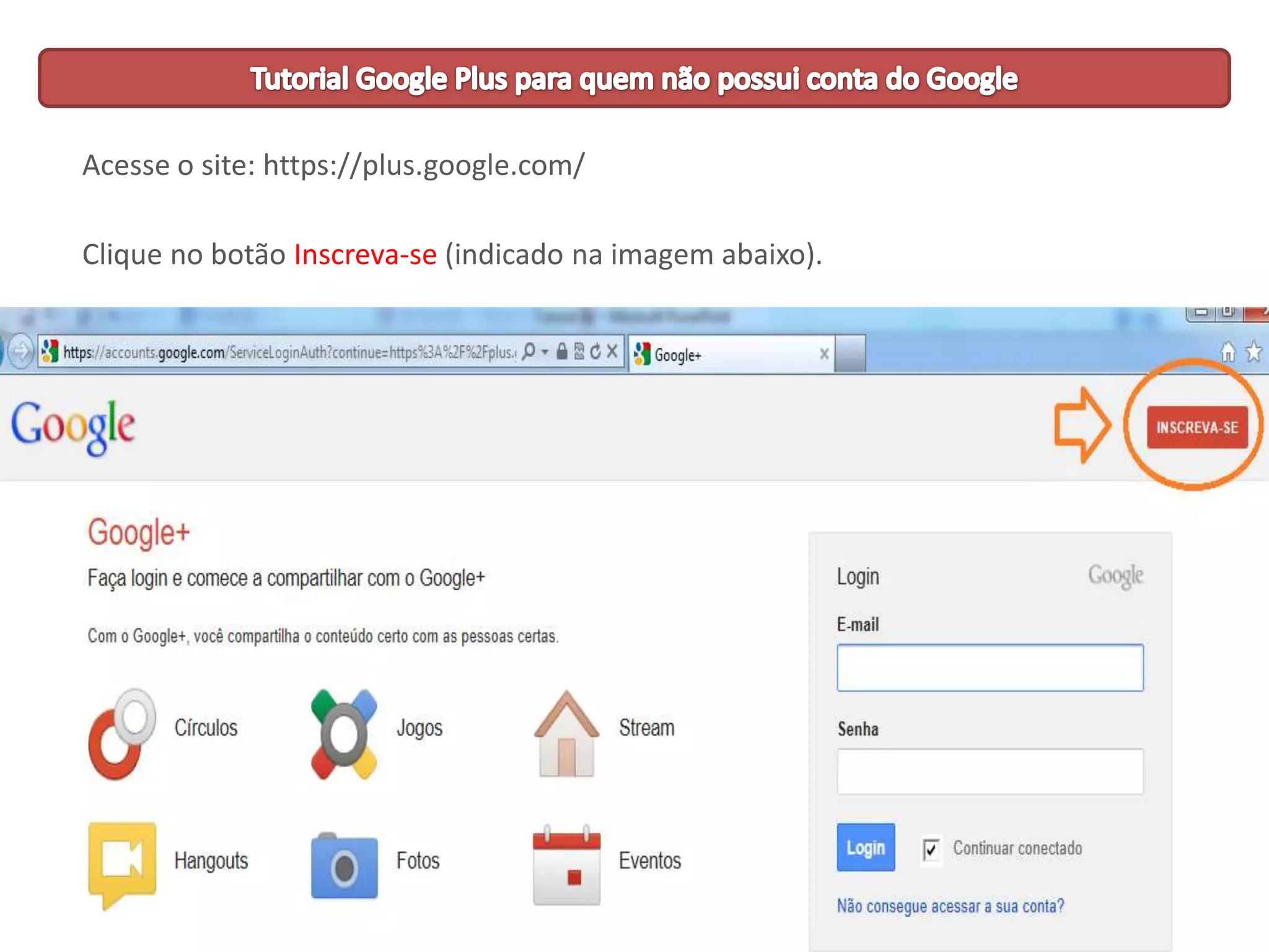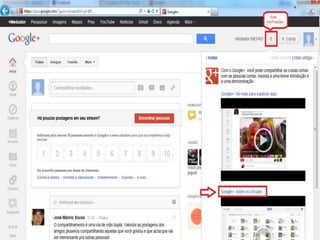 [1] O documento fornece instruções passo-a-passo para criar uma conta no Google Plus, incluindo como clicar no botão "Inscreva-se", preencher os dados pessoais, adicionar uma foto, assistir a um vídeo introdutório e explorar os recursos do site.