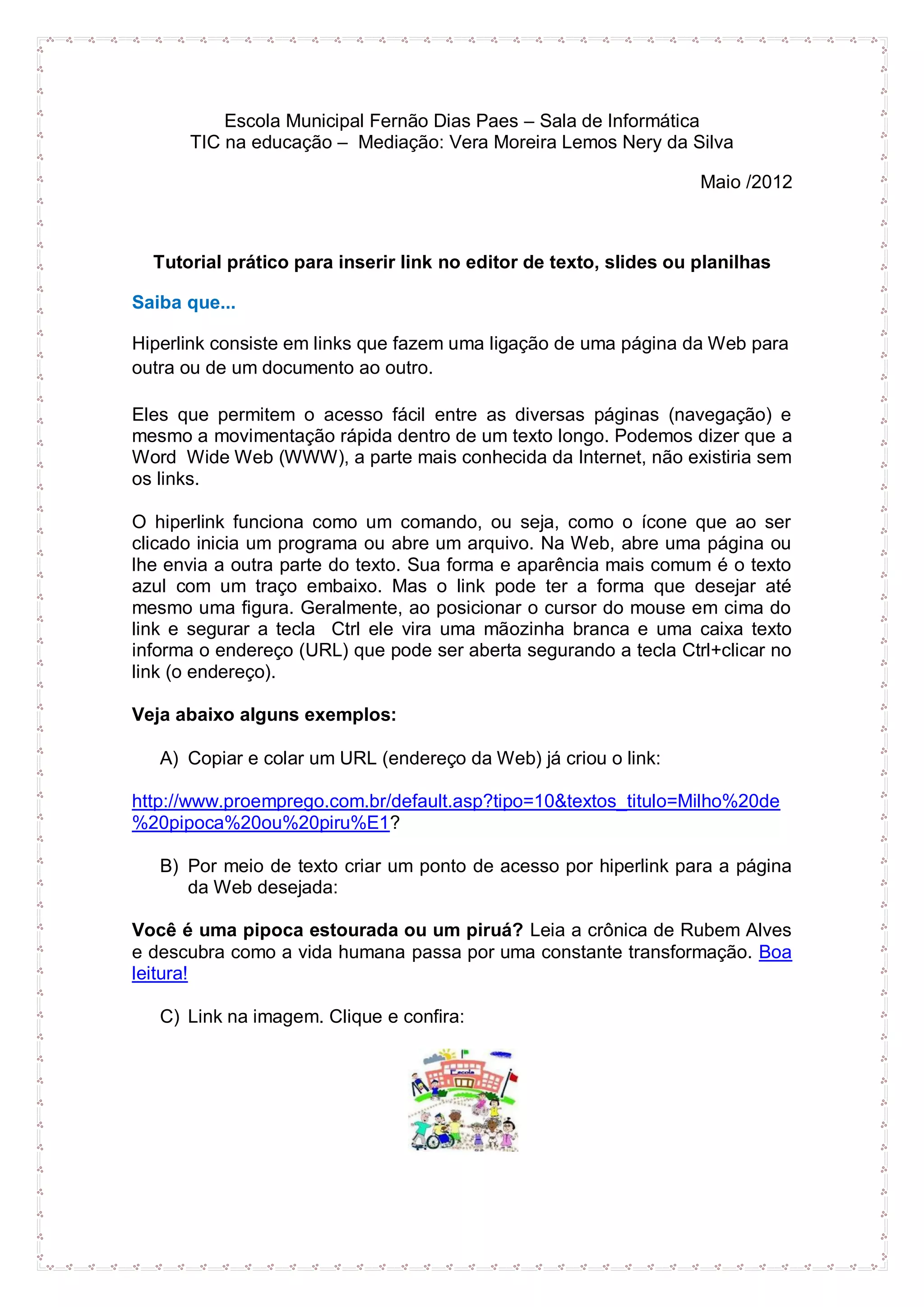 Este documento fornece instruções passo-a-passo para inserir hiperlinks e imagens em documentos do Microsoft Word, slides e planilhas. Ele explica como selecionar texto ou imagens e adicionar hiperlinks para páginas da web ou partes internas do documento. Também mostra como inserir imagens salvas no computador ou procuradas na biblioteca de clipart do Word.